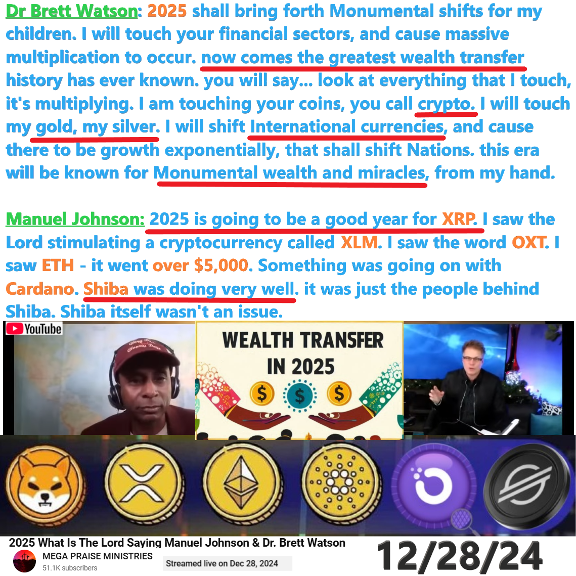 Crypto and Wealth Transfer Prophecy by Manuel Johnson and Dr Brett Watson on 12/27/24. See partial transcript and video link below: