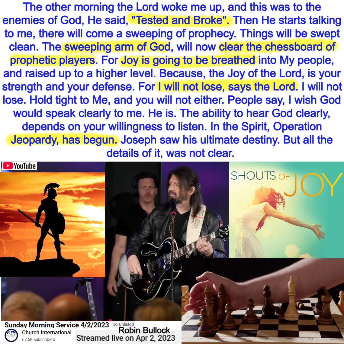 The other morning the Lord woke me up, and this was to the enemies of God, He said, “Tested and Broke”. Then He starts talking to me, there will come a sweeping of prophecy. Things will be swept clean. The sweeping arm of God, will now clear the chessboard of prophetic players. For Joy is going to be breathed into My people, and raised up to a higher level. Because, the Joy of the Lord, is your strength and your defense. For I will not lose, says the Lord. I will not lose. Hold tight to Me, and you will not either. People say, I wish God would speak clearly to me. He is. The ability to hear God clearly, depends on your willingness to listen. In the Spirit, Operation Jeopardy, has begun. Joseph saw his ultimate destiny. But all the details of it, was not clear.