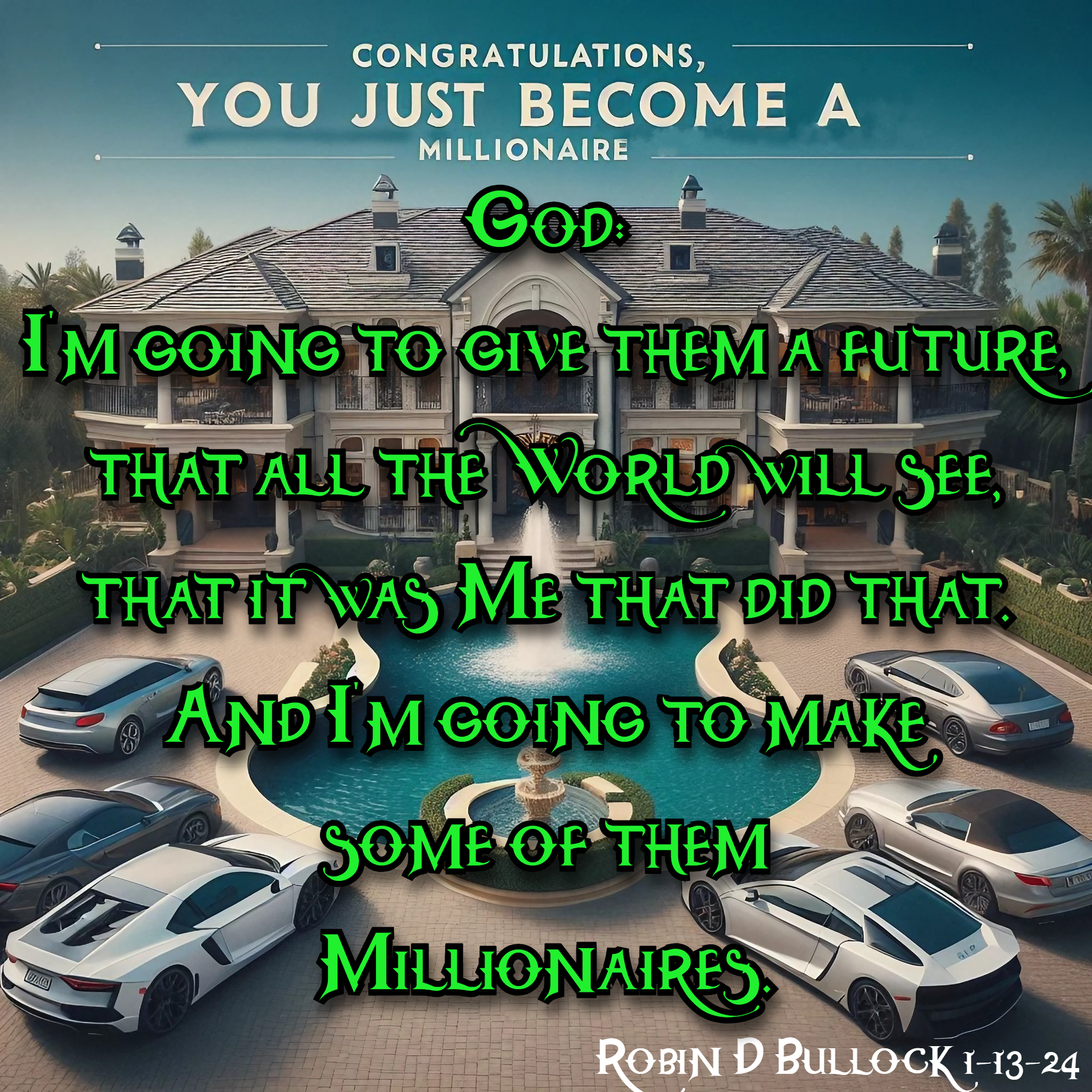 God: I’m going to give them a future, that all the World will see, that it was Me that did that. And I’m going to make some of them Millionaires. (Robin D Bullock 1–13–24)