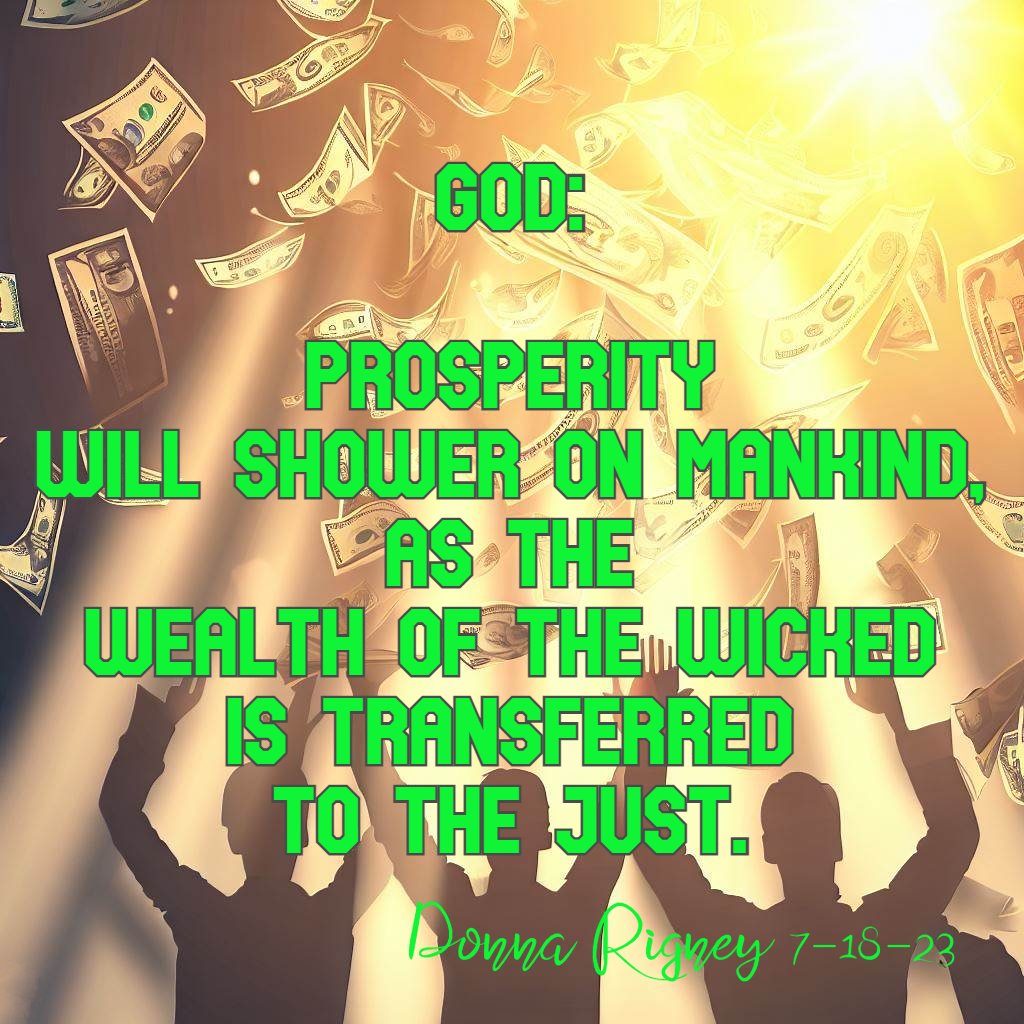 God: Prosperity will shower on mankind, as the wealth of the wicked is transferred to the just. (Donna Rigney 7-18-23)