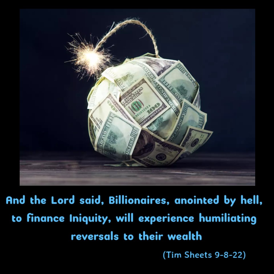 And the Lord said, Billionaires, anointed by hell, to finance Iniquity, will experience humiliating reversals to their wealth. (Tim Sheets 9-8-22)