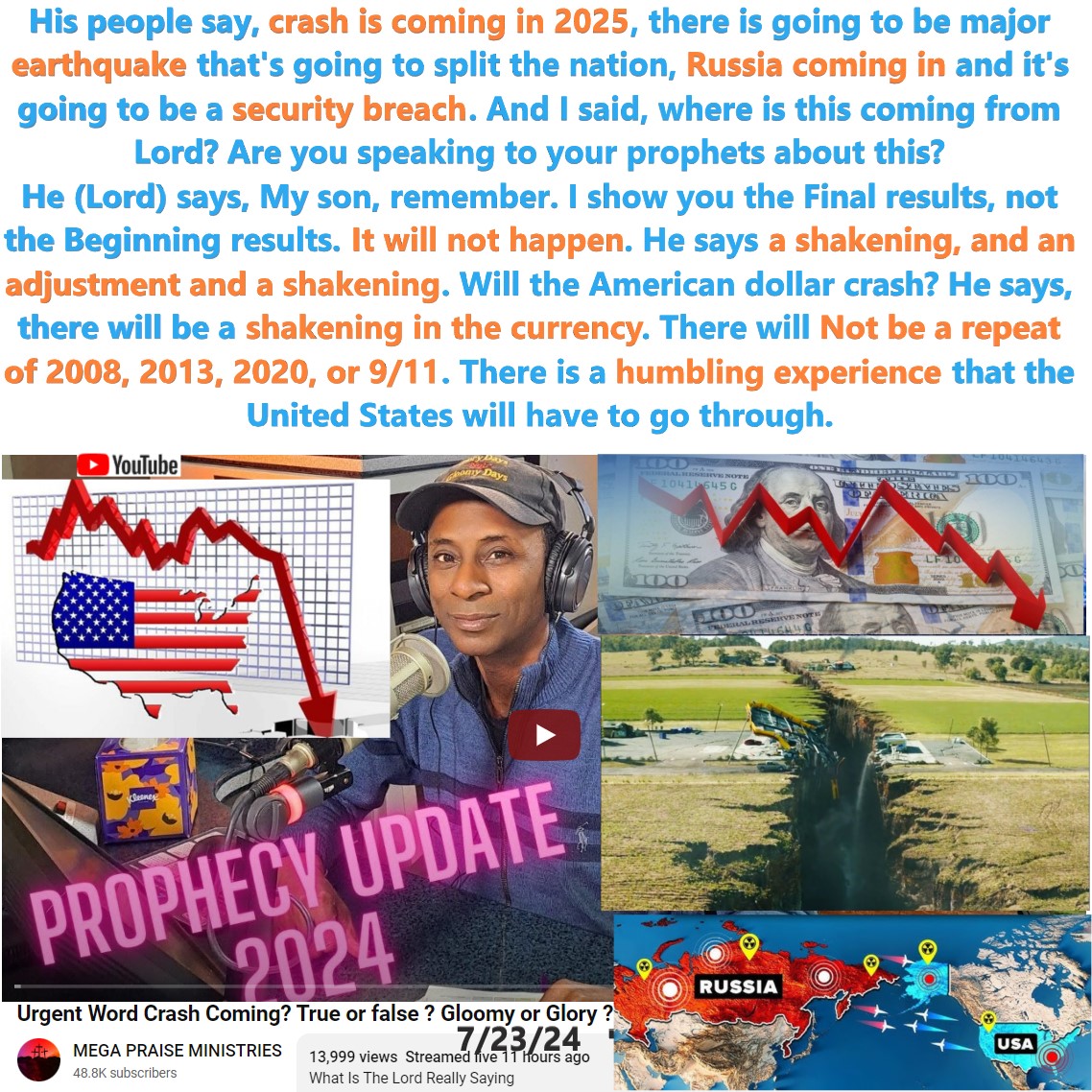 New Prophecy regarding the White House leadership, Earthquake splitting the nation, Russia attacking US, 2025 Crash, and Currency. By Manuel Johnson on 7/23/24. See partial transcript and video link below: