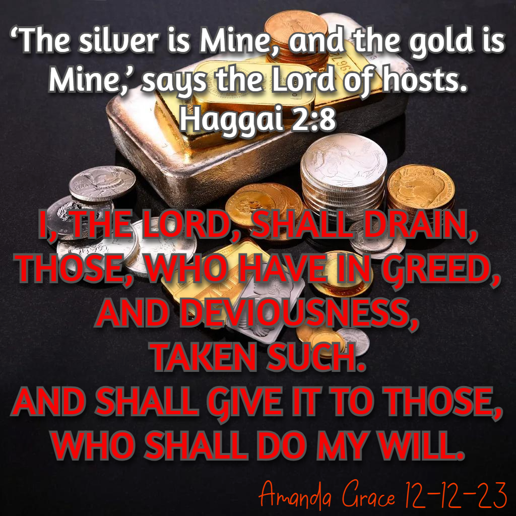 I, THE LORD, SHALL DRAIN, THOSE, WHO HAVE IN GREED, AND DEVIOUSNESS, TAKEN SUCH. AND SHALL GIVE IT TO THOSE, WHO SHALL DO MY WILL. (Amanda Grace 12-12-23)