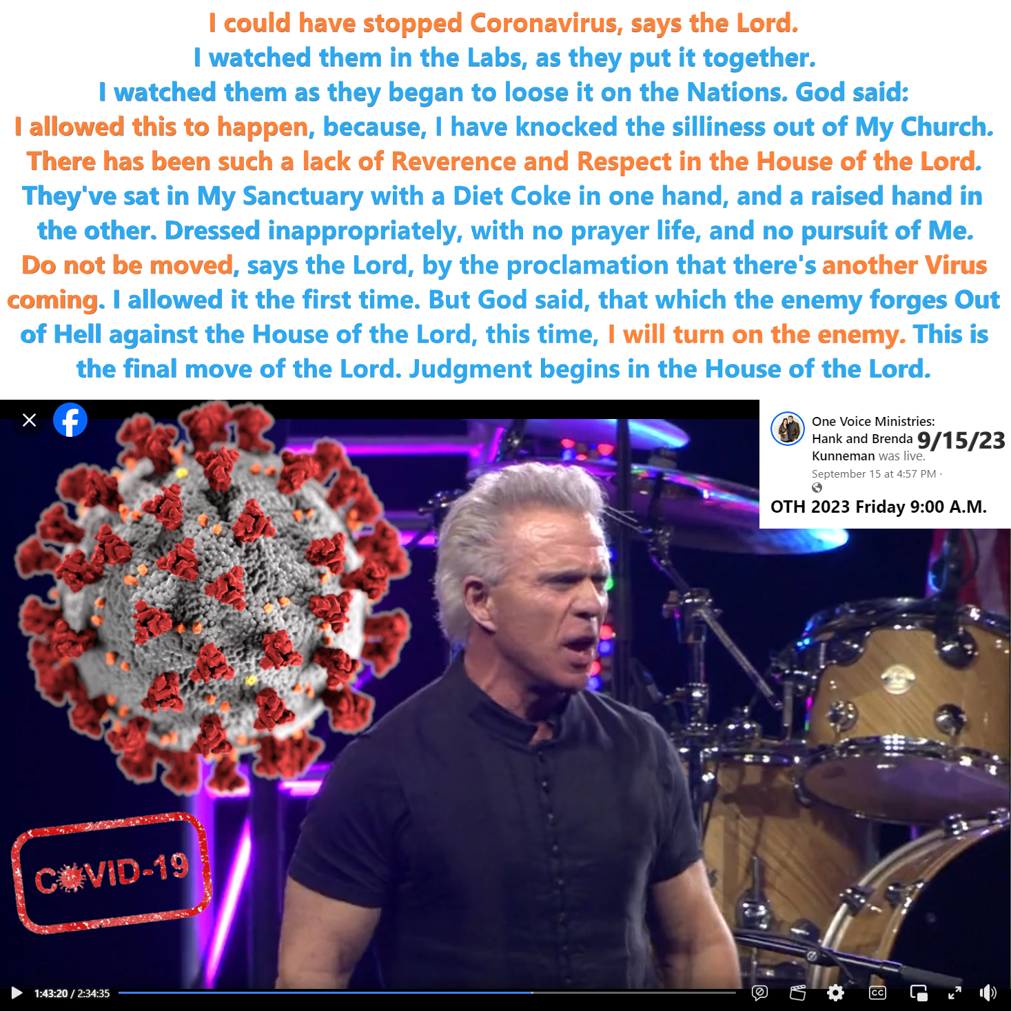 “I could have stopped Coronavirus, says the Lord. Do not be moved by the proclamation that there’s another virus coming. I allowed it the first time. But this time, I will turn on the enemy.” prophecy by Kent Christmas on 9/15/23. See partial transcript and video link below.