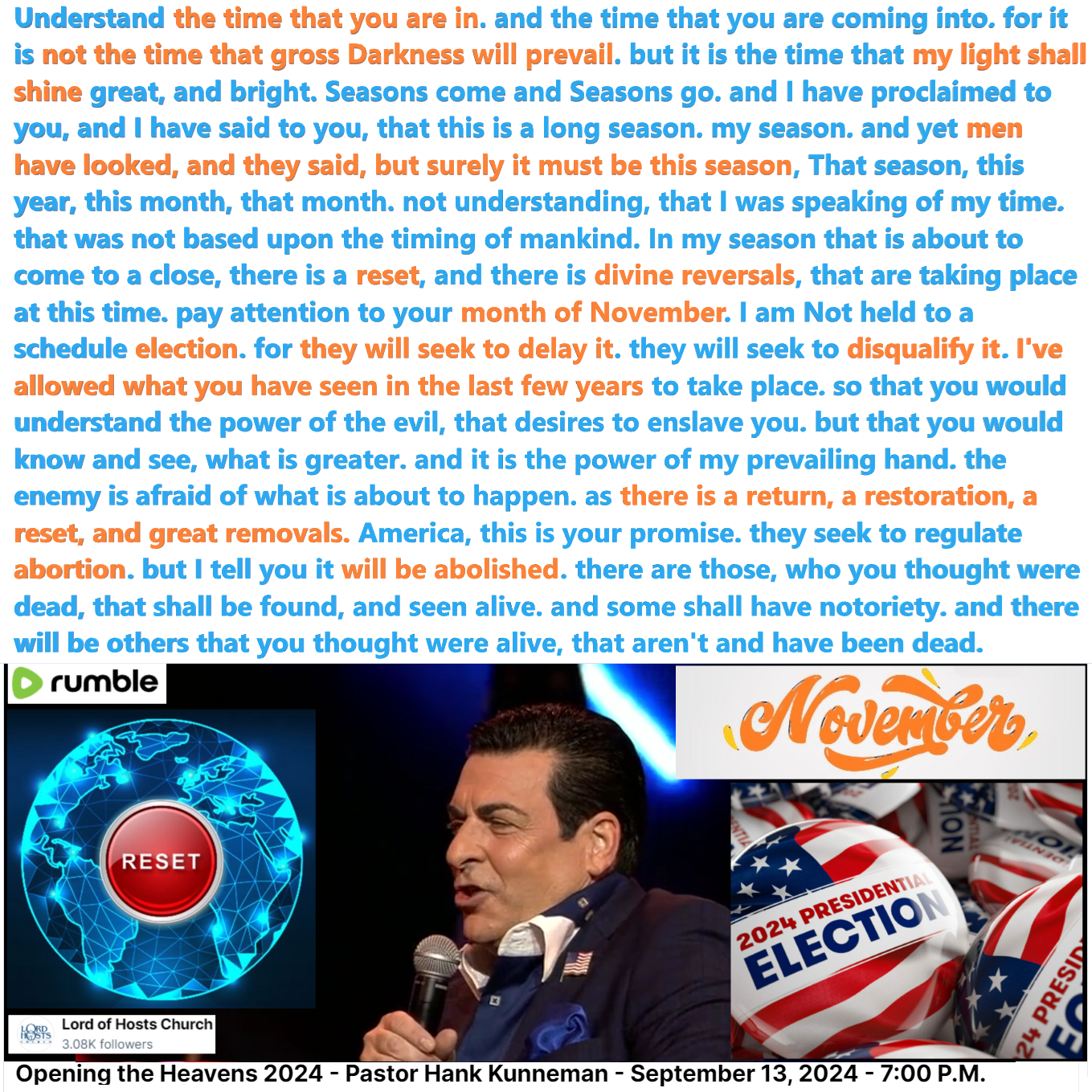 Pay attention to November. Reset, Divine Reversals. Election – they want to delay, disqualify. Abortion abolished. Prophecy by Hank Kunneman on 9/13/24. See my summary, partial transcript and video link below:
