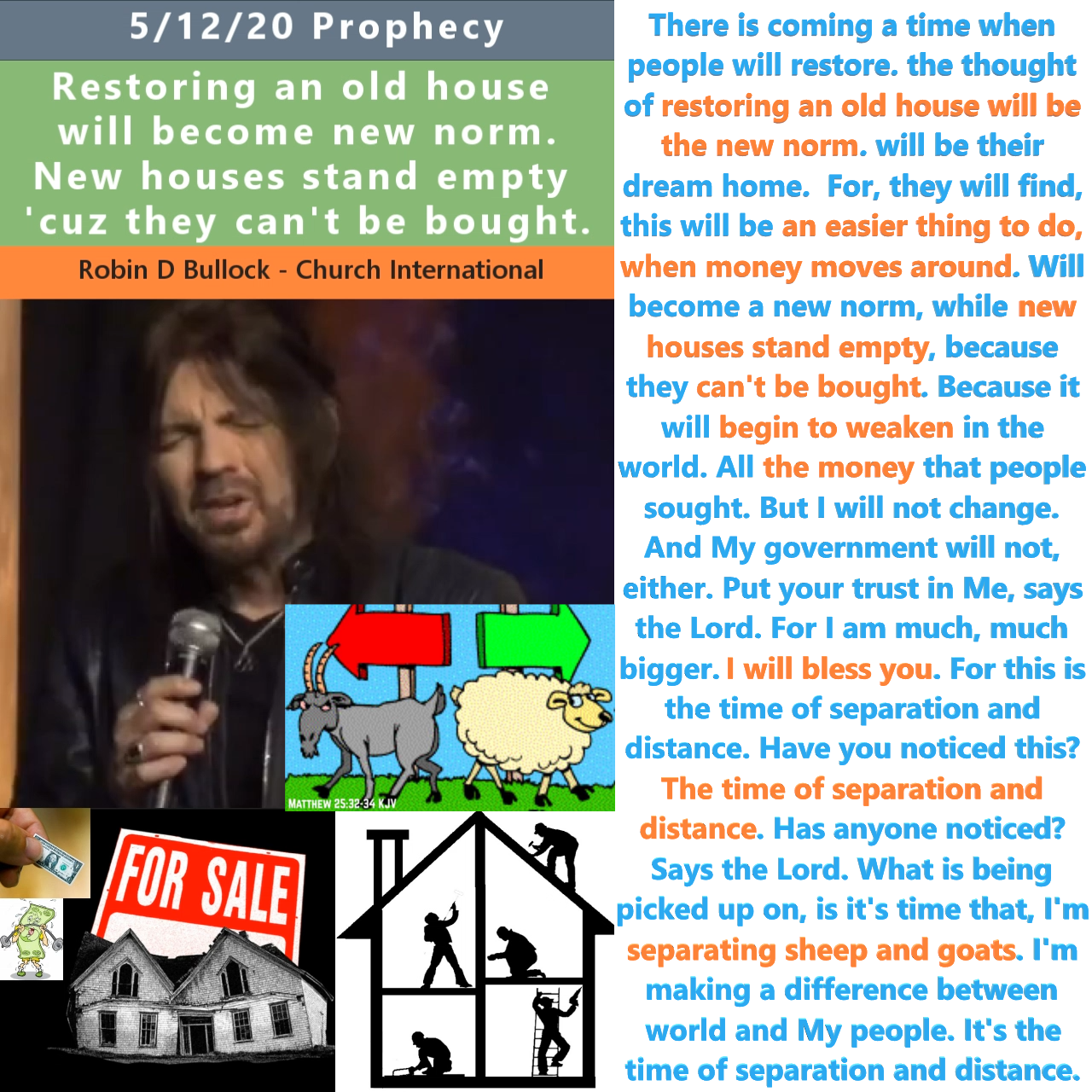 1:21:00 – there is coming a time when people will restore. the thought of restoring an old house will be the new norm. will be their dream home. For, they will find, this will be an easier thing to do, when money moves around. Will become a new norm, while new houses stand empty, because they can’t be bought. Because it will begin to weaken in the world. All the money that people sought. But I will not change. And My government will not, either. Put your trust in Me, says the Lord. For I am much, much bigger. I will bless you. For this is the time of separation and distance. Have you noticed this? The time of separation and distance. Has anyone noticed? Says the Lord. What is being picked up on, is it’s time that, I’m separating sheep and goats. I’m making a difference between world and My people. It’s the time of separation and distance.