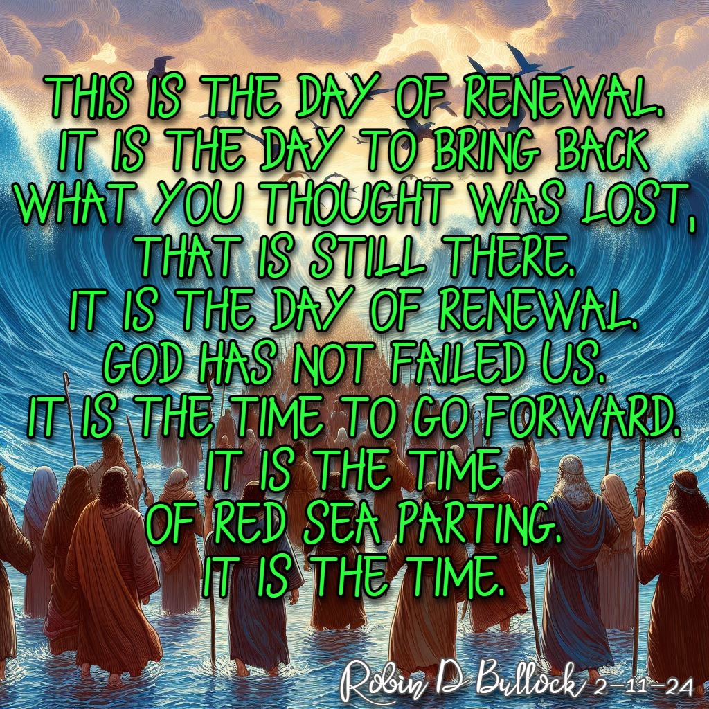 This is the Day of Renewal. It is the day to bring back what you thought was lost, that is still there. It is the Day of Renewal. God has Not failed us. It is the Time to Go Forward. It is the Time of Red Sea Parting. It is the Time. (Robin D Bullock 2-11-24)