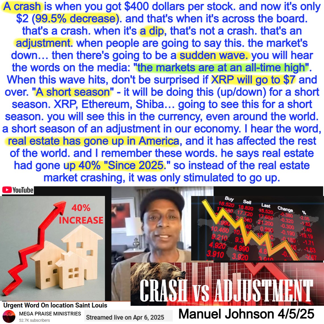 Crash vs Adjustment. Real Estate up 40% by 2030 prophecy by Manuel Johnson on 4/5/25. See partial transcript and video link below: