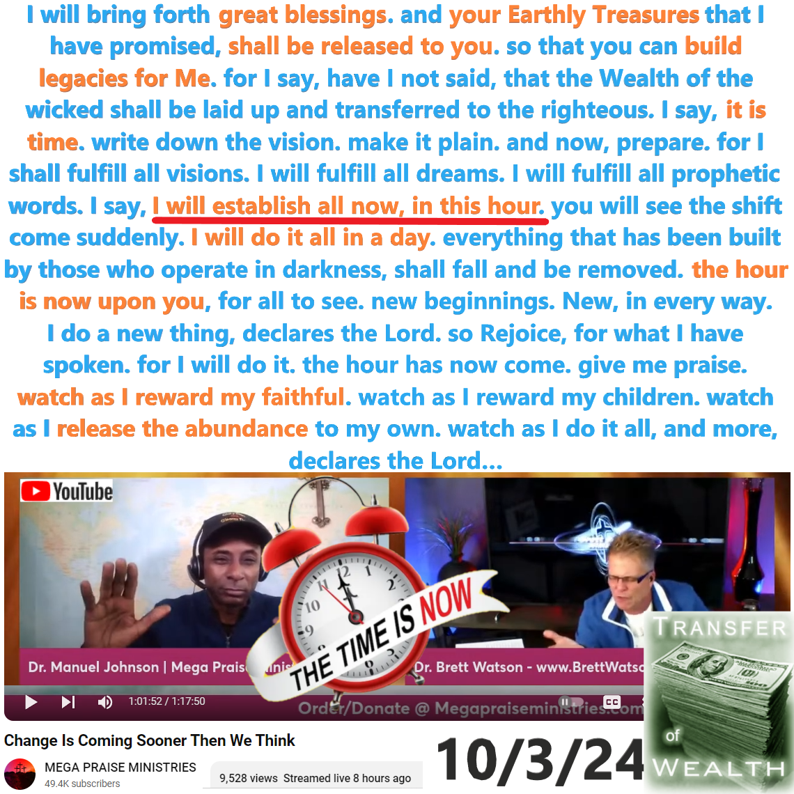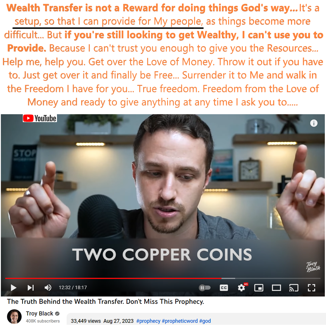 He said, I’m not going to give it to people who ain’t going to use it right. If you’re going to go out and buy a lamborghini or a mansion, I ain’t giving you the money. He said that’s not the point. But it doesn’t mean he doesn’t want you to have nice things, and you won’t be blessed by the Wealth Transfer, and there’s not going to be beautiful things for the kingdom of god, and His people that are Faithful. But it’s only going to come with those funds being used for his Kingdom first.