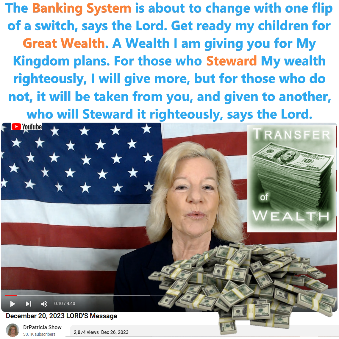 There also has to be a wealth transfer. Because if it happens, he (devil) has to begin the tribulation broke. If he (devil) can get the great tribulation, in before the transfer, then he (devil) gets to keep all the wealth. If he cannot, then he has to begin the 7-year tribulation broke. If there is no money/wealth on this earth, there’s no power. There will be a Wealth transfer.