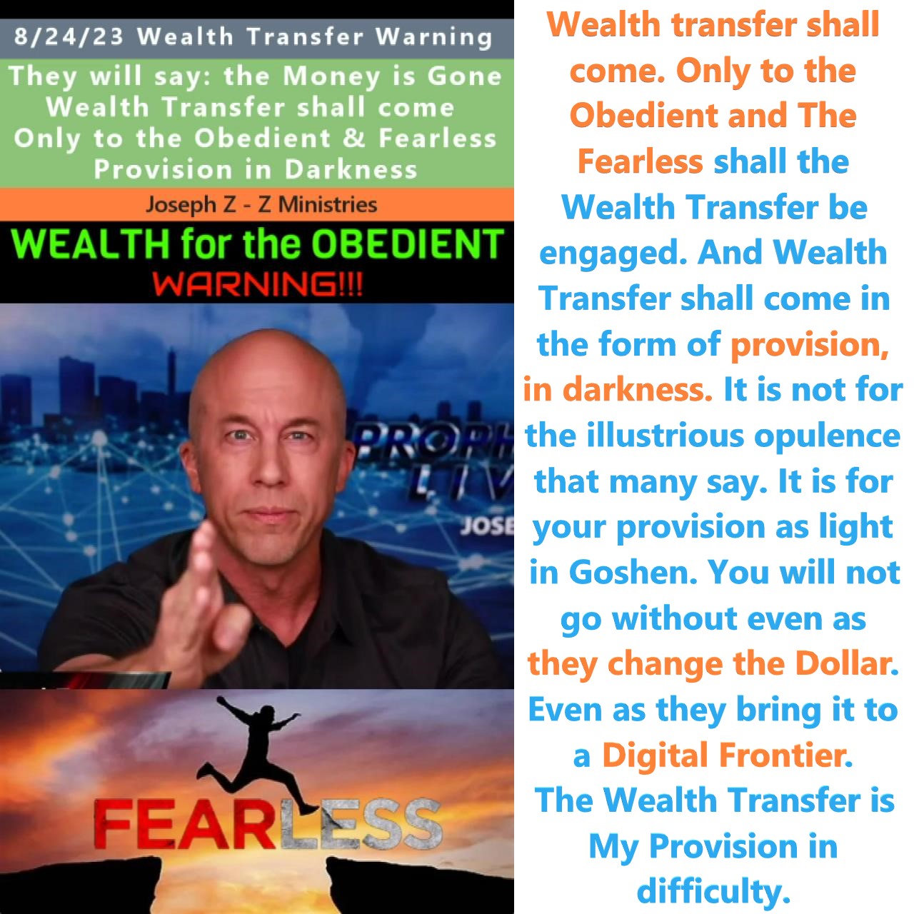 Wealth transfer shall come. But I say, only to the Obedient, and the Fearless. Only to the Obedient and The Fearless shall the Wealth Transfer be engaged. And Wealth Transfer shall come in the form of provision, in darkness. It is not for the illustrious opulence that many say. It is for your provision as light in Goshen. You will not go without even as they change the Dollar. Even as they bring it to a Digital Frontier. The Wealth Transfer is My Provision in difficulty.