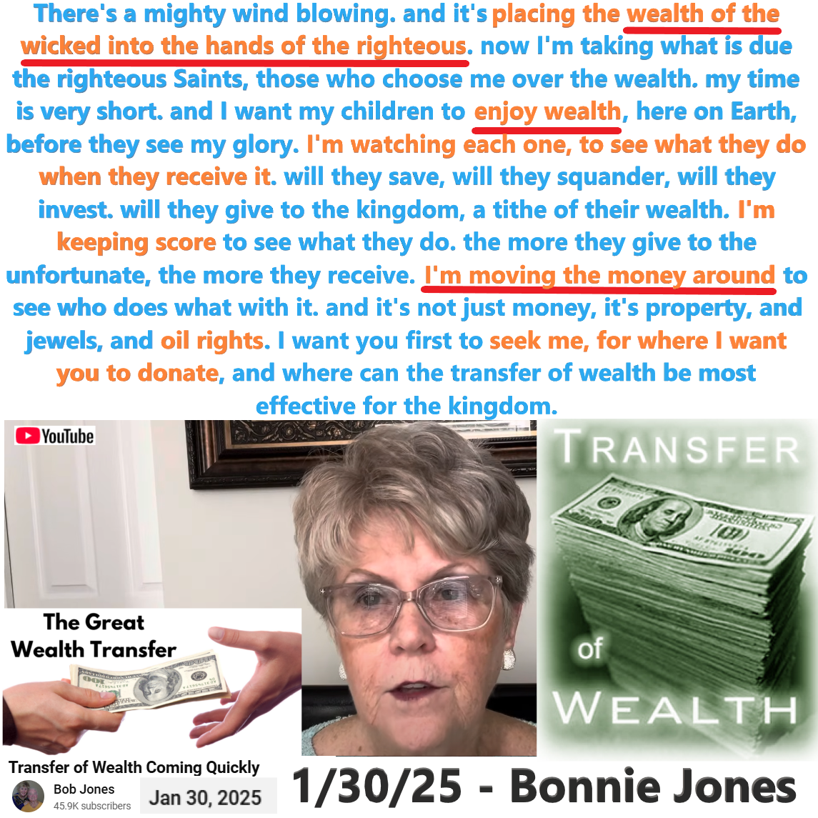 There’s a mighty wind blowing, placing the wealth of the wicked into the hands of the righteous. Prophecy by Bonnie Jones on 1/30/25. See partial transcript and video link below: