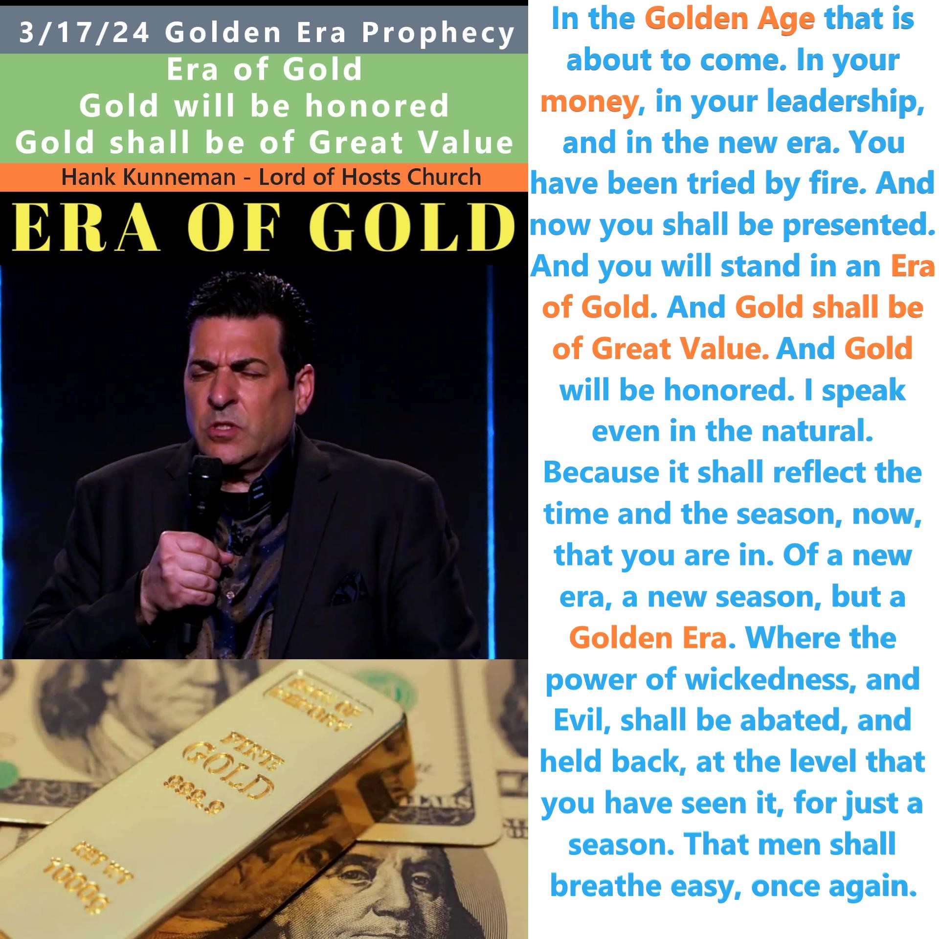 But you will know, that I am the Lord God, who is truthful, just, righteous and real. Because men will see, that no matter how much Influence, Power, Money, Networking, Marketing, Manipulating, they cannot out maneuver Me. I will get My honor. My son shall be glorified. And the children shall be free. In the Golden Age that is about to come. In your money, in your leadership, and in the new era. You have been tried by fire. And now you shall be presented. And you will stand in an Era of Gold. And Gold shall be of Great Value. And Gold will be honored. I speak even in the natural. Because it shall reflect the time and the season, now, that you are in. Of a new era, a new season, but a Golden Era. Where the power of wickedness, and Evil, shall be abated, and held back, at the level that you have seen it, for just a season. That men shall breathe easy, once again. And an Awakening shall arise. That many will turn to My son. That will lead to many righteous acts. That shall take place in your government, your schools, legislation, through your media. And there will come a great, great change. And the internet that you know today, shall not be the internet of your tomorrow. (Hank Kunneman 3-17-24)