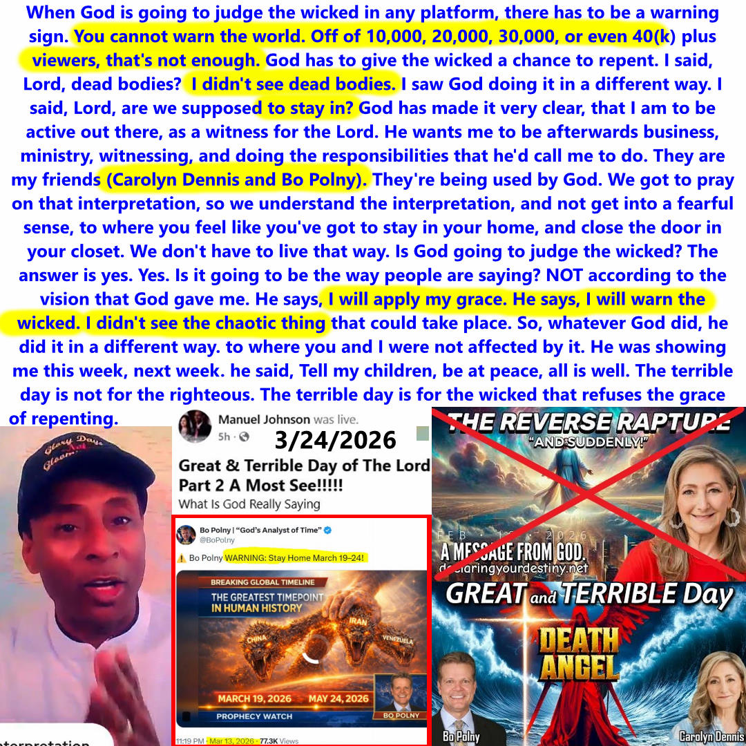 Great and Terrible Day prophecy misinterpretation explained. Wicked can still repent. Prophecy by Manuel Johnson on 3/24/26. See my summary, partial transcript, ai summary, and video links below. Manuel Johnson removed the YouTube video few hours after the live (my guess is he was pressured by Bo Polny). The video is still up on Rumble and Facebook, for now. Watch before it’s deleted. I do have a backup, so let me know if it’s taken down.