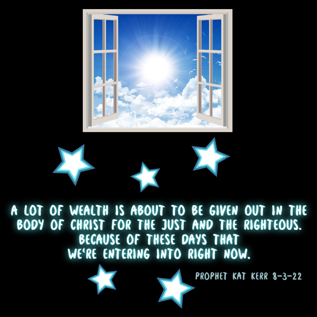 A lot of Wealth is about to be given out in the Body of Christ for the Just and the Righteous. Because of these days that we’re entering into right now. (Prophet Kat Kerr 8-3-22)