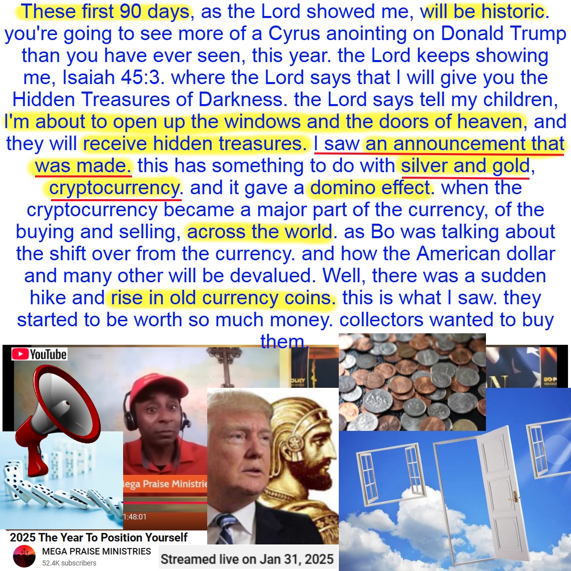 These first 90 days, as the Lord showed me, will be historic. you’re going to see more of a Cyrus anointing on Donald Trump than you have ever seen, this year. the Lord keeps showing me, Isaiah 45:3. where the Lord says that I will give you the Hidden Treasures of Darkness. the Lord says tell my children, I’m about to open up the windows and the doors of heaven, and they will receive hidden treasures. I saw an announcement that was made. this has something to do with silver and gold, cryptocurrency. and it gave a domino effect. when the cryptocurrency became a major part of the currency, of the buying and selling, across the world. as Bo was talking about the shift over from the currency. and how the American dollar and many other will be devalued. Well, there was a sudden hike and rise in old currency coins. this is what I saw. they started to be worth so much money. collectors wanted to buy them.
