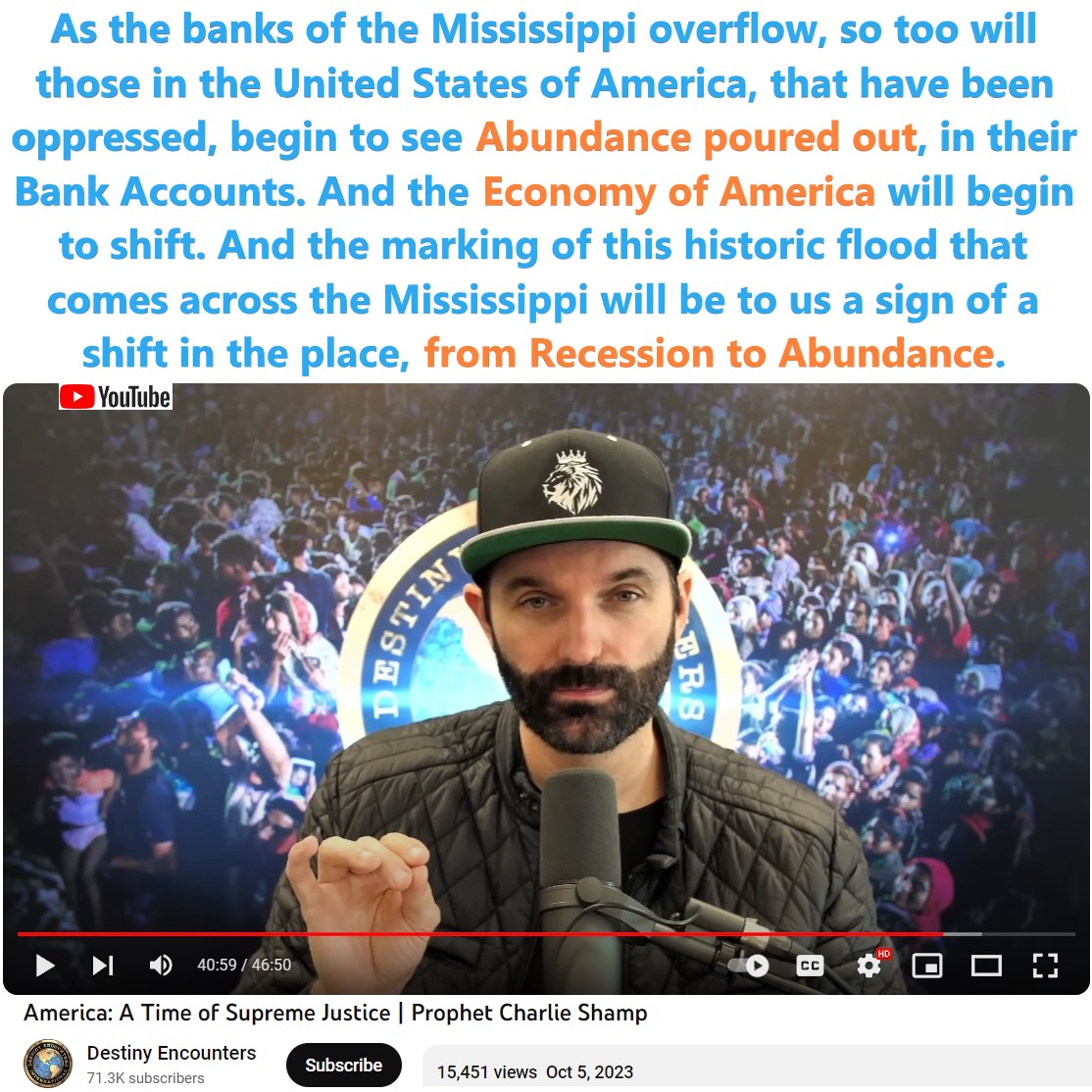 22:50 – And I saw the news agencies speaking about this historic flood that hit the Mississippi River. And the Lord told me that in the midst of this, recognize it as a sign of the changing of the economy in America. That there would be an overflow. That as the banks of the Mississippi overflow, so too will those in the United States of America, that have been oppressed, begin to see abundance poured out, in their Bank Accounts. And the Economy of America will begin to shift. And the marking of this historic flood that comes across the Mississippi will be to us a sign of a shift in the place, from Recession to Abundance. So there are Divine Shifts and there are new things that are coming.