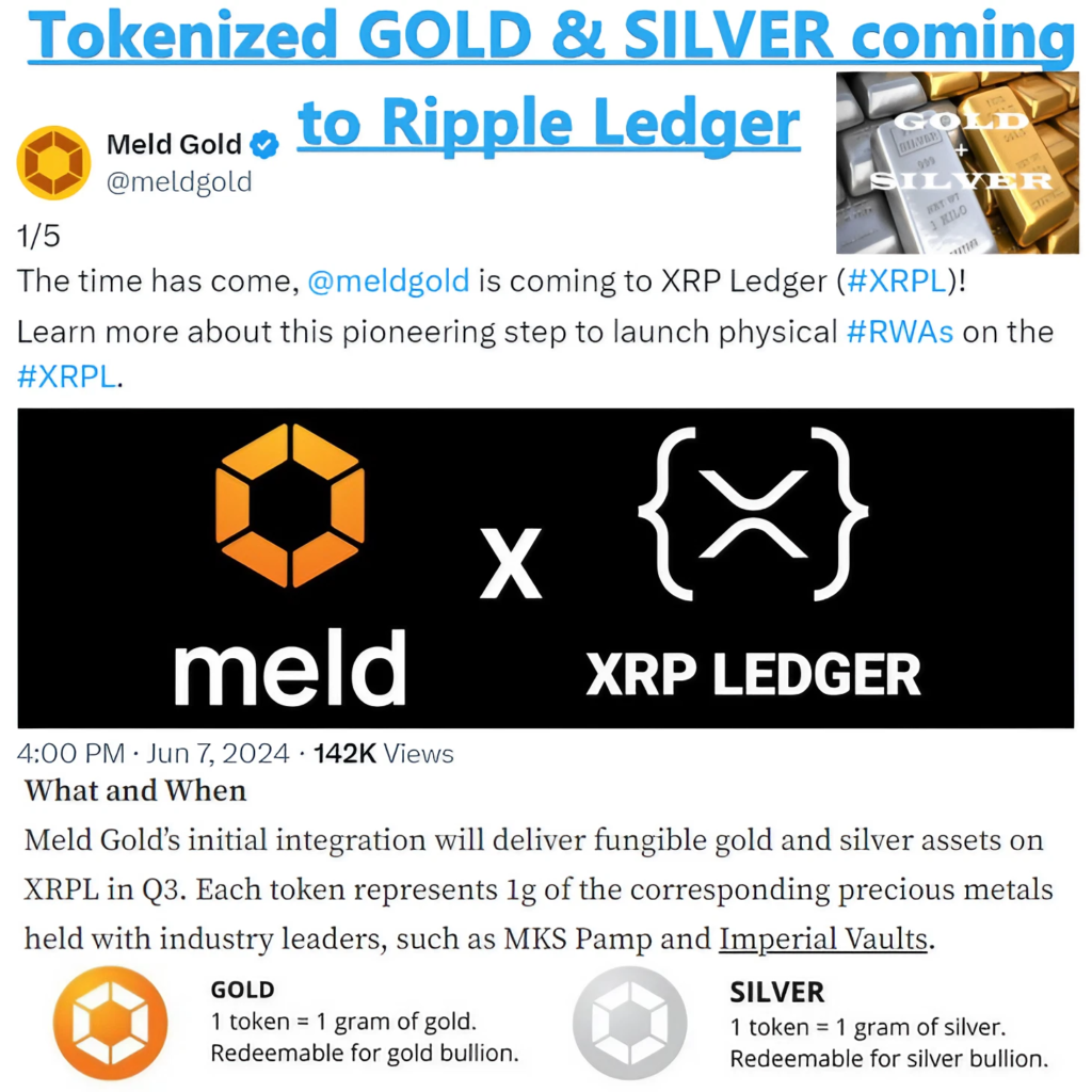 Tokenized Gold and Silver coming to Ripple Ledger (XRPL) in 3rd Quarter of 2024. Meld Gold’s integration will deliver fungible GOLD and SILVER assets on XRPL in Q3. Each token represents 1g of the corresponding precious metals held with industry leaders, such as MKS Pamp and Imperial Vaults.