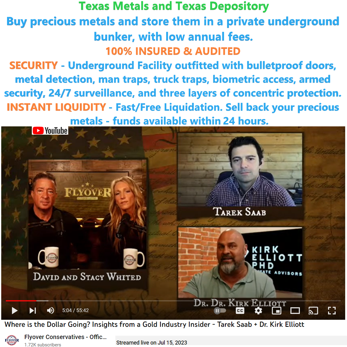 On 7/15/23 Flyover Conservatives channel featured Dr. Kirk Elliott who you’ve probably seen on Men In America and various other Conservative/Christian youtube channels, as well as Tarek Saab who is the Chief Operating Officer and co-founder of Texas Precious Metals LLC.