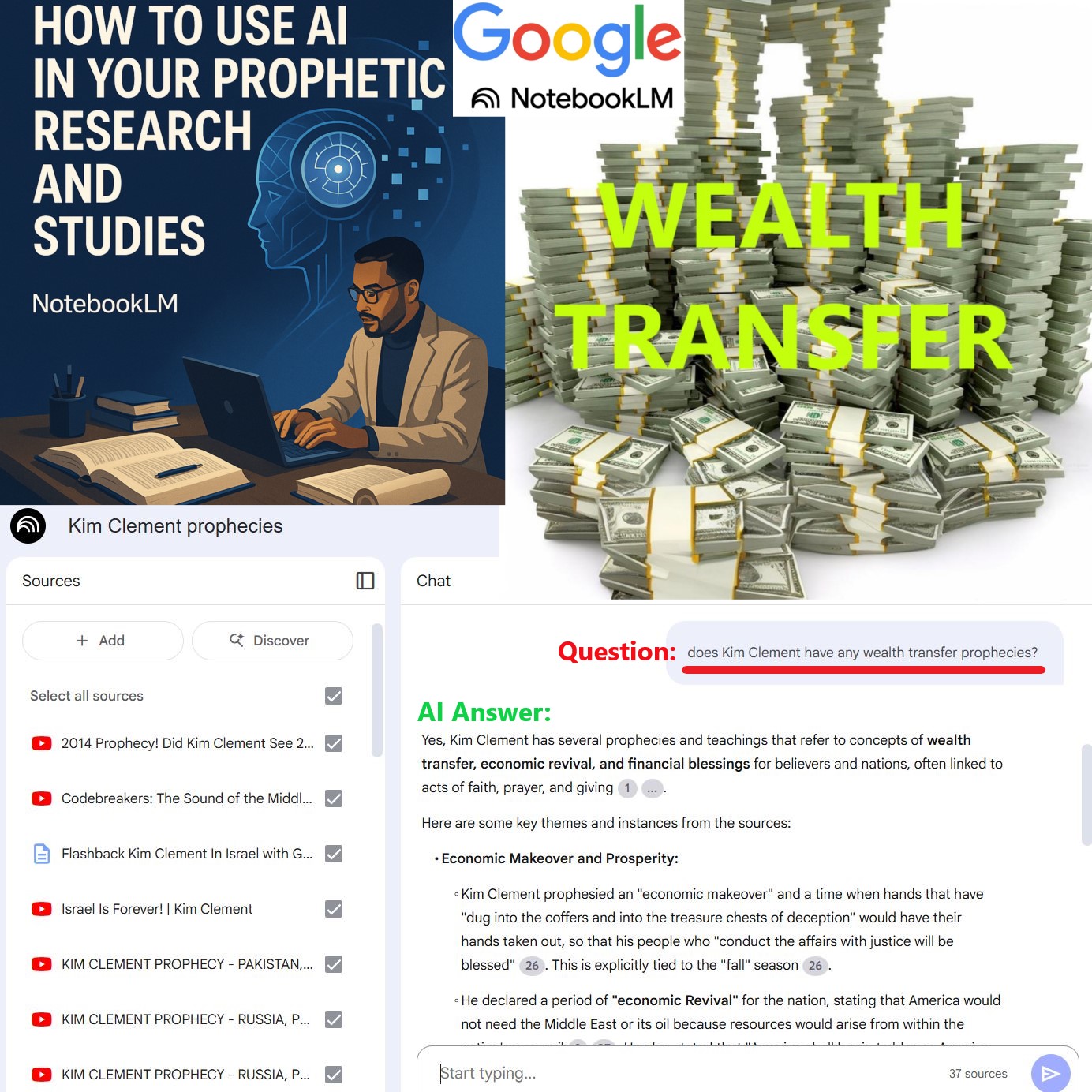 I started using NotebookLM recently for the Prophetic Money channel, to more quickly and easily find prophecies. In the post picture I included a screenshot of Kim Clement’s prophecies, with me asking the AI if Kim Clement had any Wealth Transfer prophecies. I included the full AI response at the bottom of this post.