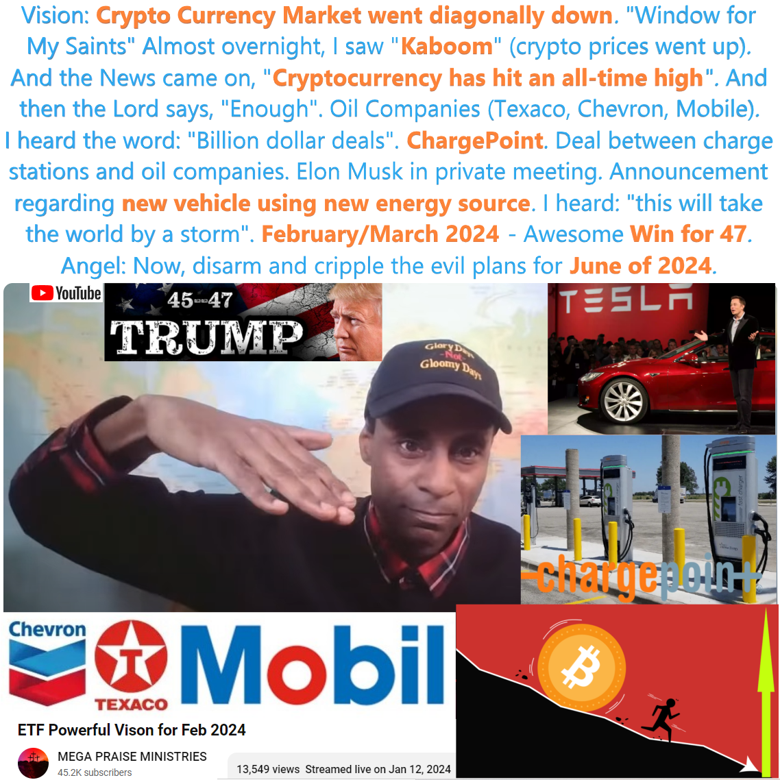 Crypto, Tesla, ChargePoint prophecy by Manuel Johnson on 1/12/24. See partial transcript and video link below: