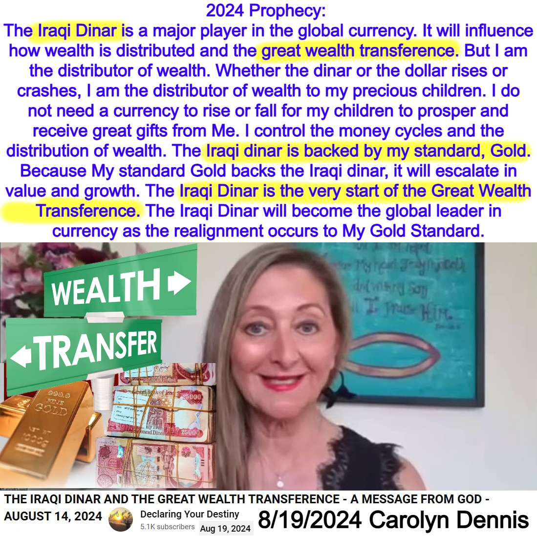 The Iraqi Dinar is the very start of the Great Wealth Transference. Prophecy by Carolyn Dennis on 8/19/2024. See partial transcript, AI Summary, and video link below: