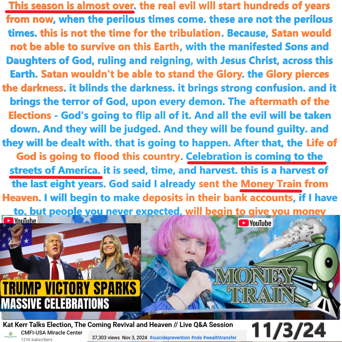 This season is almost over. Celebration is coming. Prophetic Word and Teaching by Kat Kerr on 11/3/24. See partial transcript and video link below.