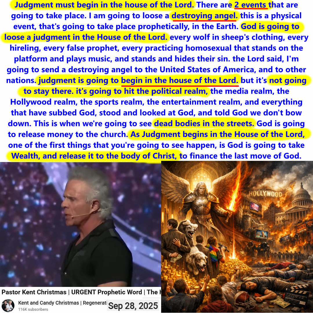 2 events to take place. God is going to loose a Judgment in the House of the Lord. Destroying Angel. Then judgments will hit, political, Hollywood, entertainment realms. Wealth will be released after Judgment begins in the House of the Lord. Prophecy by Kent Christmas on 6/30/2025. See transcript, my summary, and video link below: