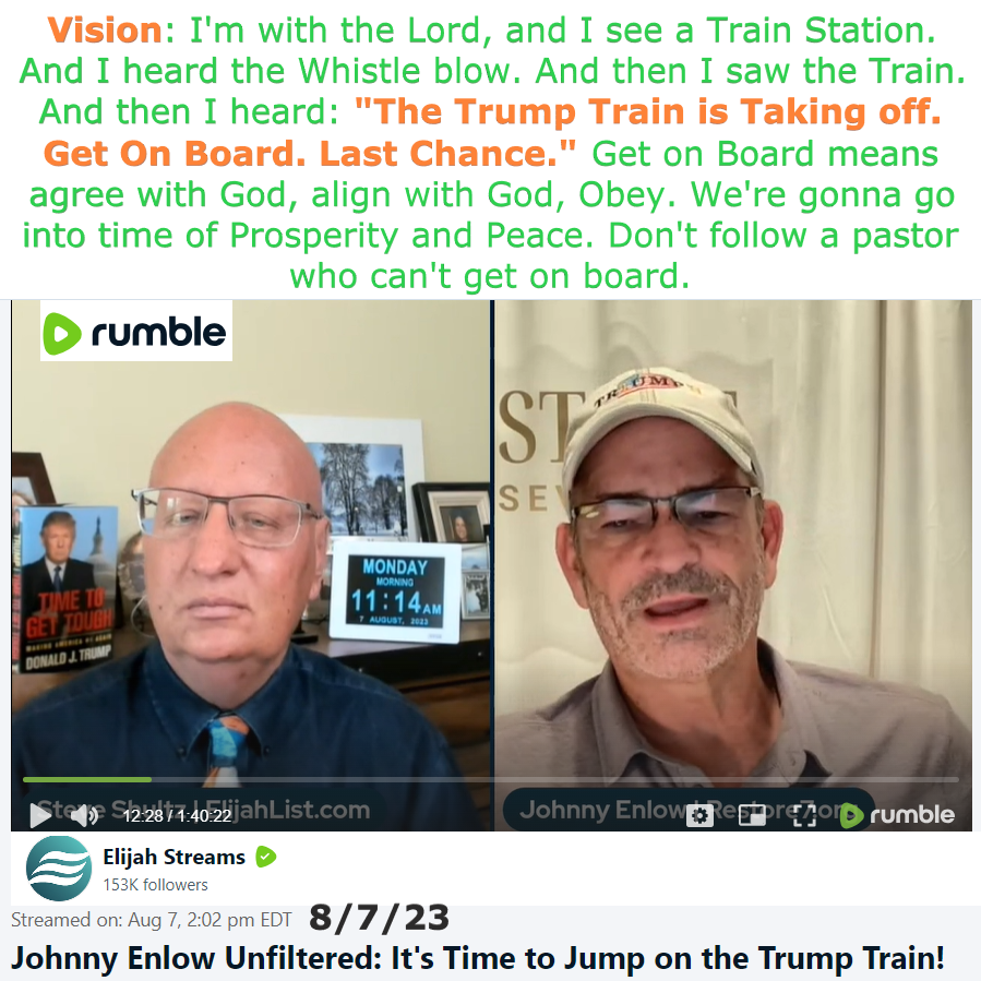 “The Trump Train is Taking off. Get On Board. Last Chance.” Prophecy by Johnny Enlow on 8/7/23. See partial transcript and video link below: