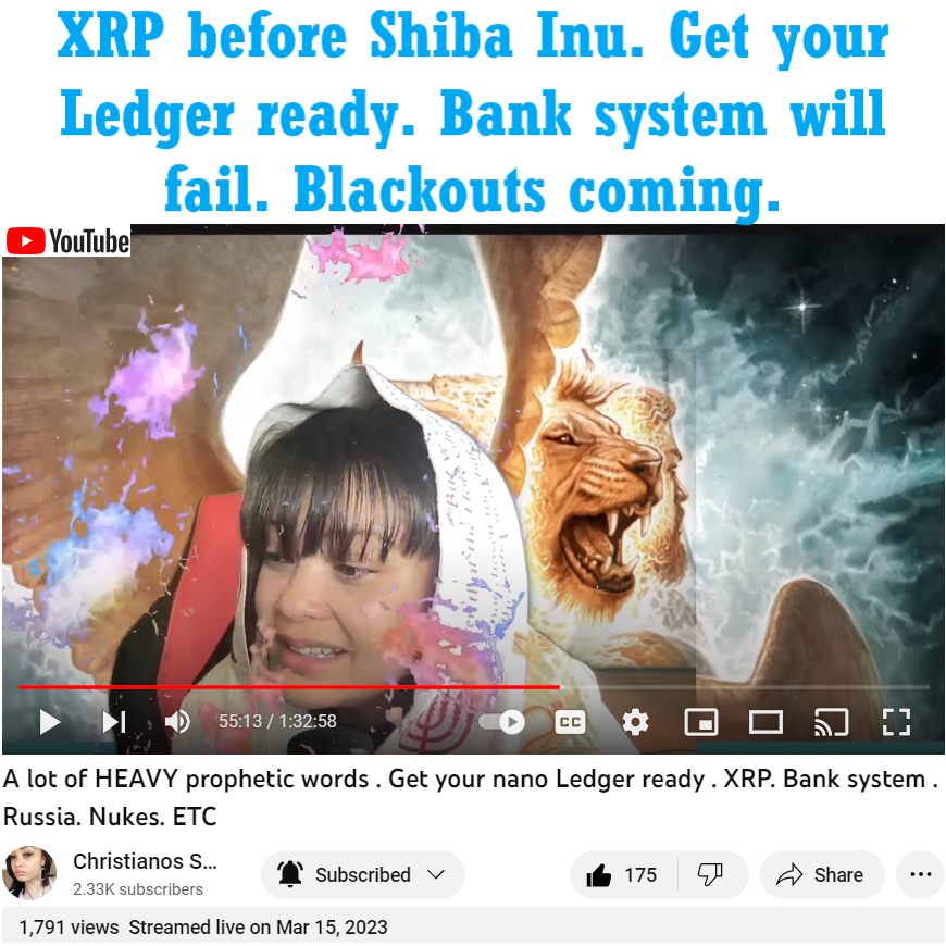 Christina (@christianosservantofgod ) shared a new prophetic word on 3/16/23. Get your Ledger ready. Bank system will fail. XRP before Shiba Inu. Blackouts coming. Please see video link, and partial transcript below.