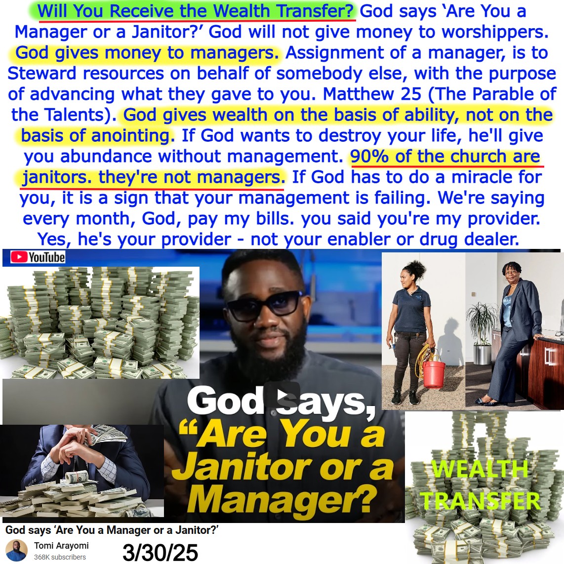 Will You Receive the Wealth Transfer? God says ‘Are You a Manager or a Janitor?’ God gives money to managers. Teaching by Tomi Arayomi on 3/30/25. See my summary, partial transcript, and video link below:
