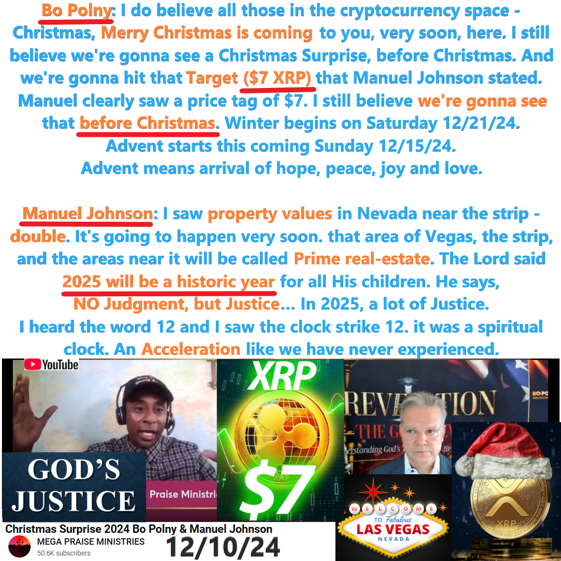 Bo Polny $7 XRP by Christmas prediction. Manuel Johnson Vegas Strip Real Estate to Double and 2025 Justice (NOT Judgment) prophecy. See partial transcript and video link below:
