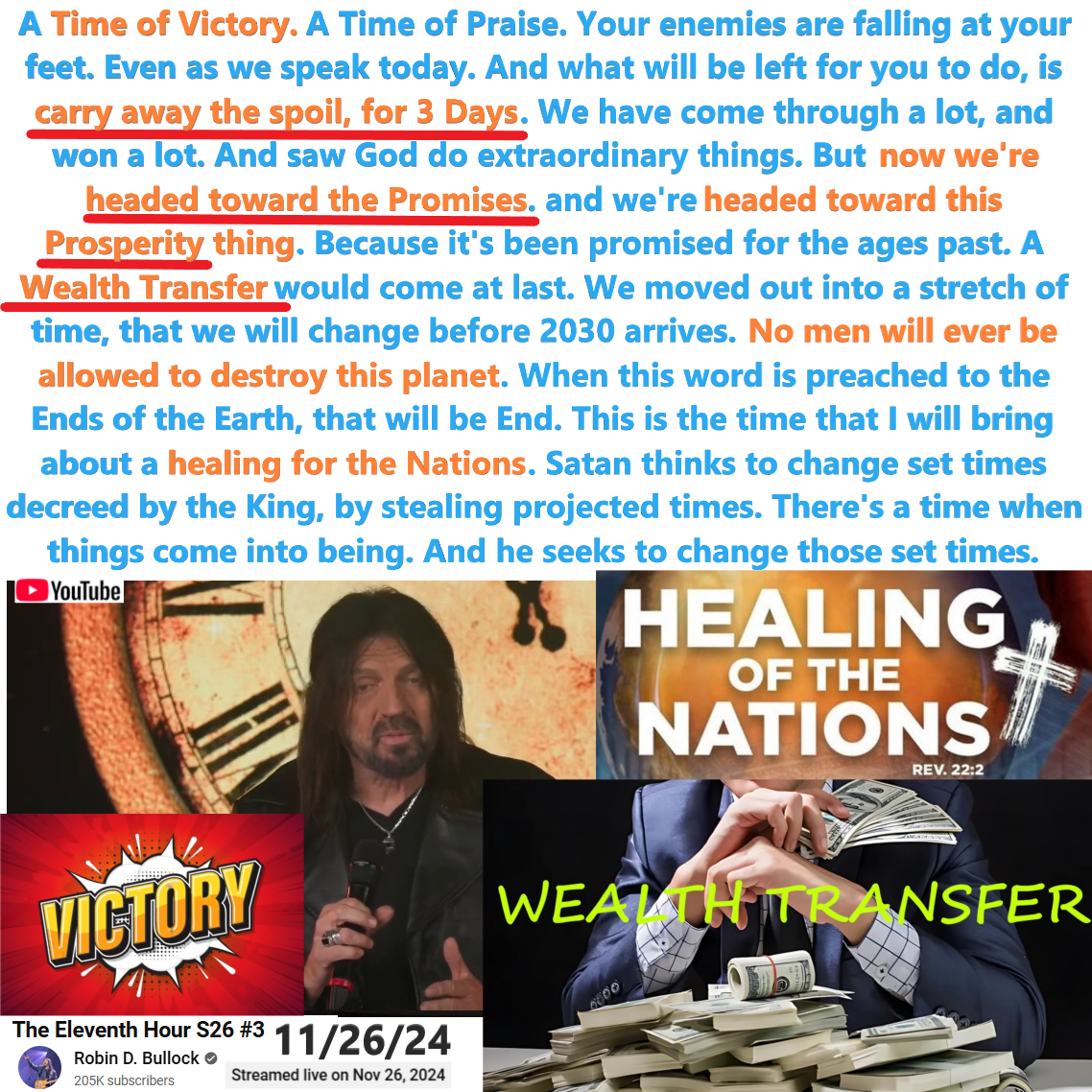 Now we’re headed toward the Promises, Prosperity, promised for the ages past. A Wealth Transfer would come at last. Prophecy by Robin Bullock on 11/26/24. See my summary, partial transcript, and video link below.