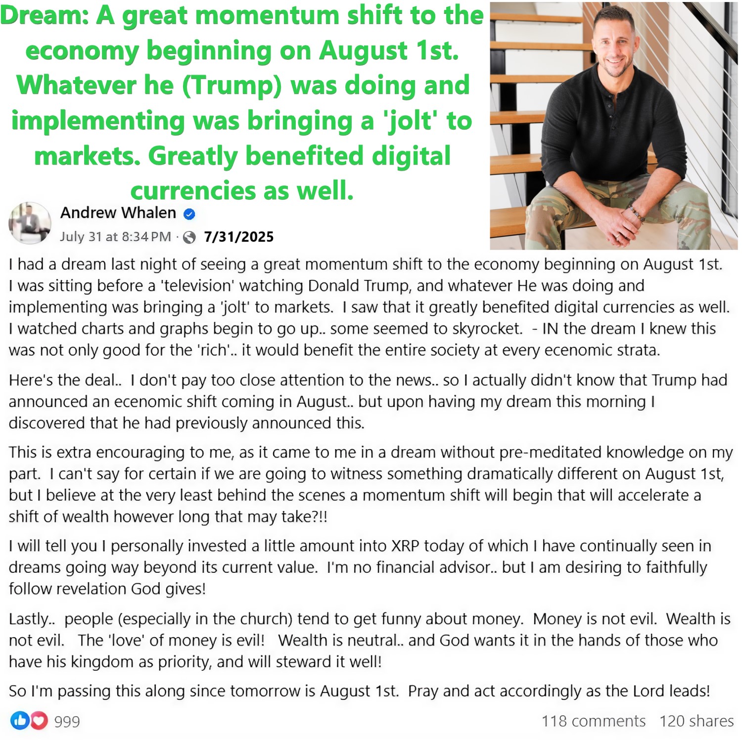 A great momentum shift to the economy beginning on August 1st. Whatever he (Trump) was doing and implementing was bringing a ‘jolt’ to markets. Greatly benefited digital currencies as well. Prophetic Dream by Andrew Whalen on 7/31/25