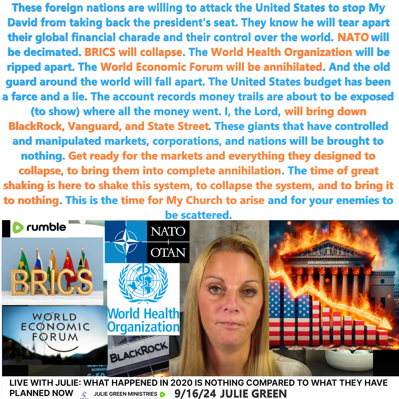 NATO will be decimated. BRICS will collapse. The World Health Organization will be ripped apart. The World Economic Forum will be annihilated. And the old guard around the world will fall apart.