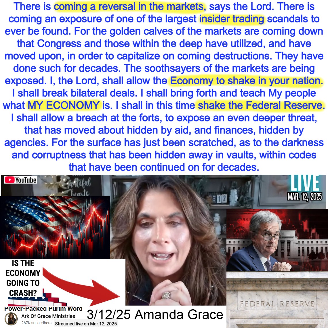 There is coming a reversal in the markets, says the Lord. I shall allow the Economy to shake in your nation. I shall in this time shake the Federal Reserve. Prophecy by Amanda Grace on 3/12/25. See partial transcript and video link below: