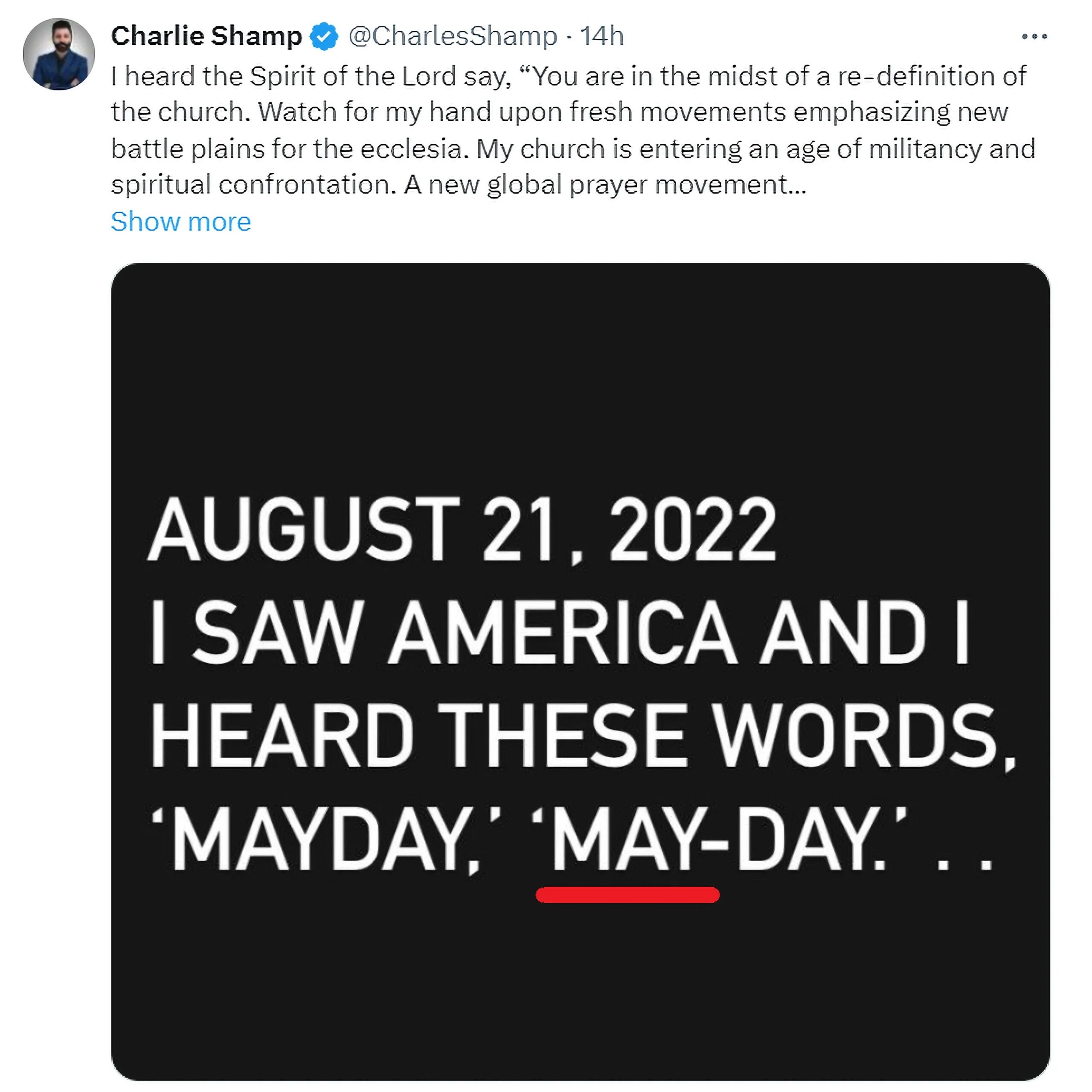 I saw America and I heard these words, ‘Mayday,’ ‘May-Day.’ I then heard the Spirit of the Lord say, “For those that call upon my name I will be the Prince of Peace in the eye of the storm.” Prophecy by Charlie Shamp on 8/21/22.