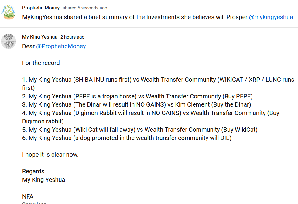 - My King Yeshua (PEPE is a trojan horse) vs Wealth Transfer Community (Buy PEPE)
