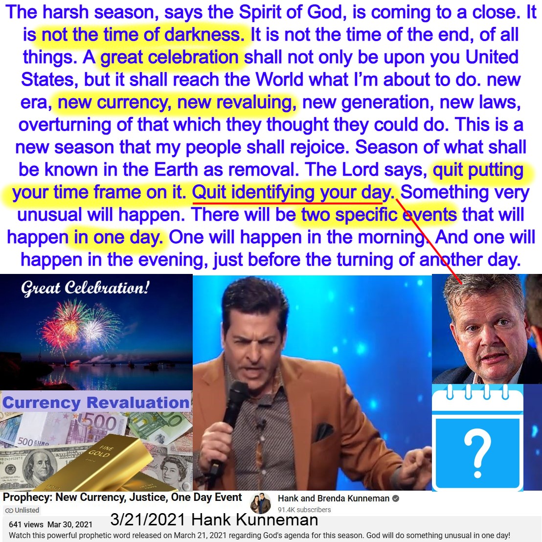 2 Specific Events in 1 Day. New Era, New CURRENCY, New Revaluing. The Lord says, quit putting your time frame on it. Quit identifying your day. Prophecy by Hank Kunneman on 3/21/2021. See transcript, my summary, and video link below: