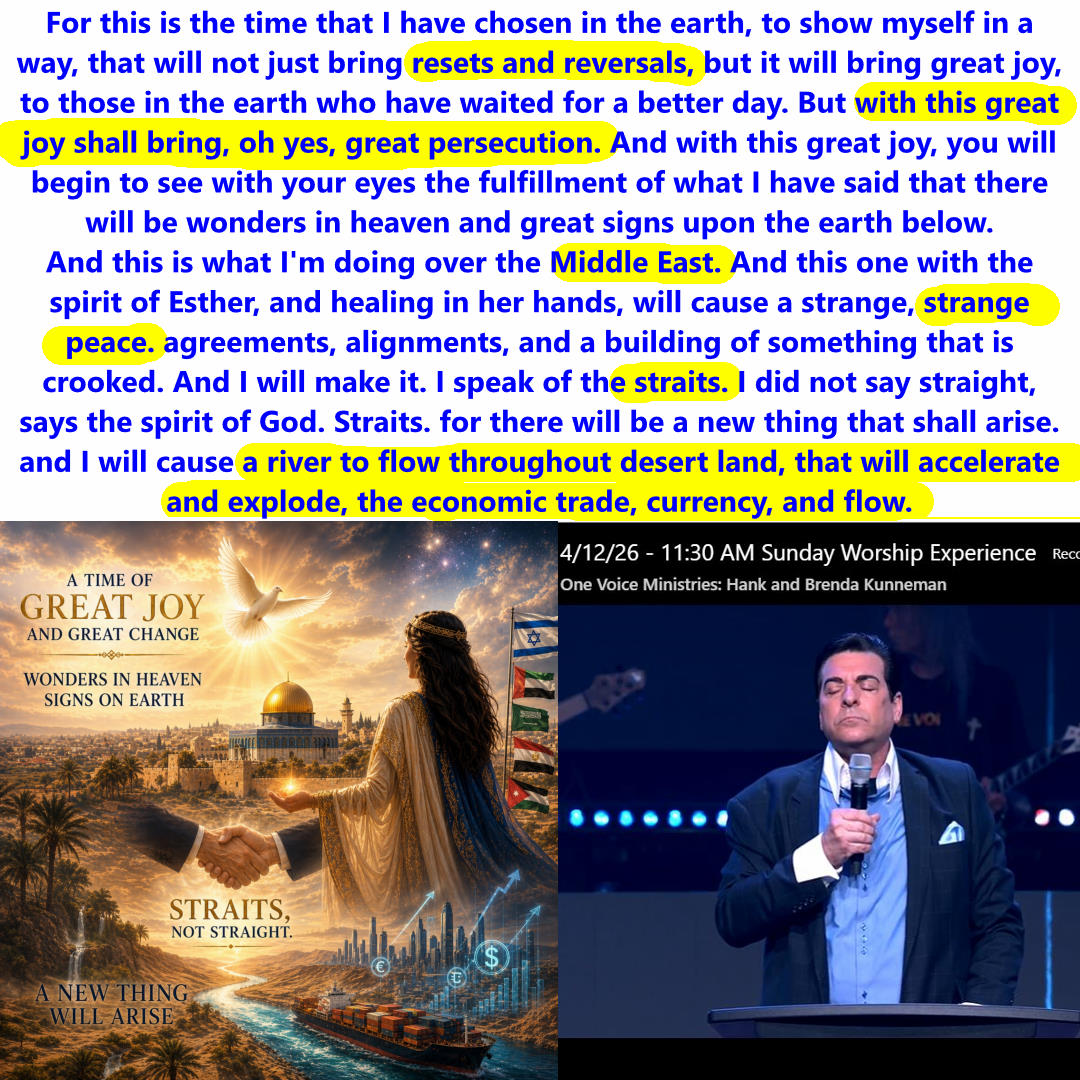 Resets, Reversals, Great Joy and Persecution in the Earth. Peace in the Middle East. Acceleration and Explosion of economic trade and currency. Prophecy by Hank Kunneman on 4/12/2026. See partial transcript and video link below: