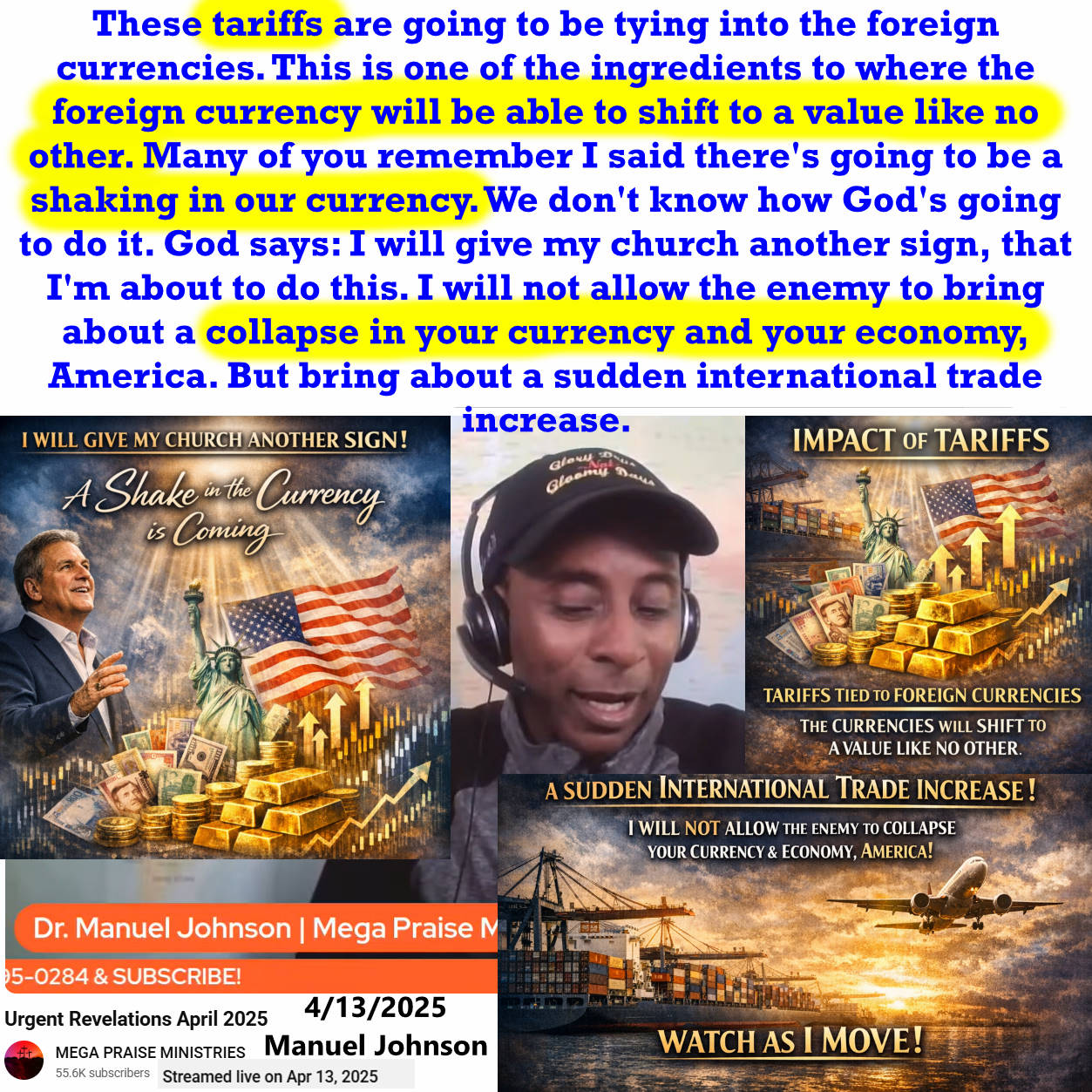 I will not allow the enemy to bring about a collapse in your currency and your economy, America. Prophecy by Manuel Johnson on 4/13/2025. See partial transcript, ai summary, and video link below:
