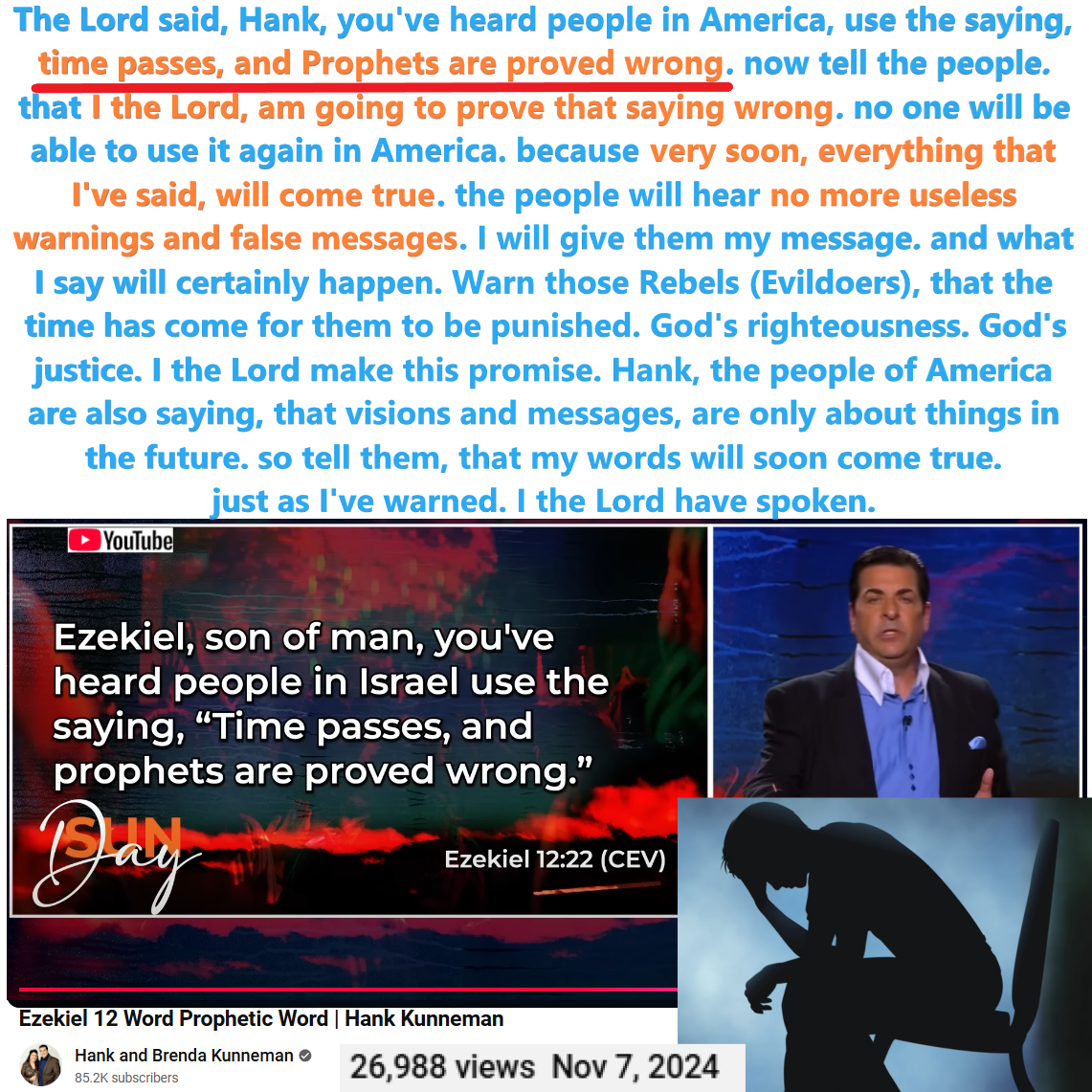 Let’s look at the scripture. The Lord said, Hank, you’ve heard people in America, use the saying, time passes, and Prophets are proved wrong. now tell the people. that I the Lord, am going to prove that saying wrong. no one will be able to use it again in America. because very soon, everything that I’ve said, will come true. the people will hear no more useless warnings and false messages. I will give them my message. and what I say will certainly happen. Warn those Rebels (Evildoers), that the time has come for them to be punished. God’s righteousness. God’s justice. I the Lord make this promise. Hank, the people of America are also saying, that visions and messages, are only about things in the future. so tell them, that my words will soon come true. just as I’ve warned. I the Lord have spoken.