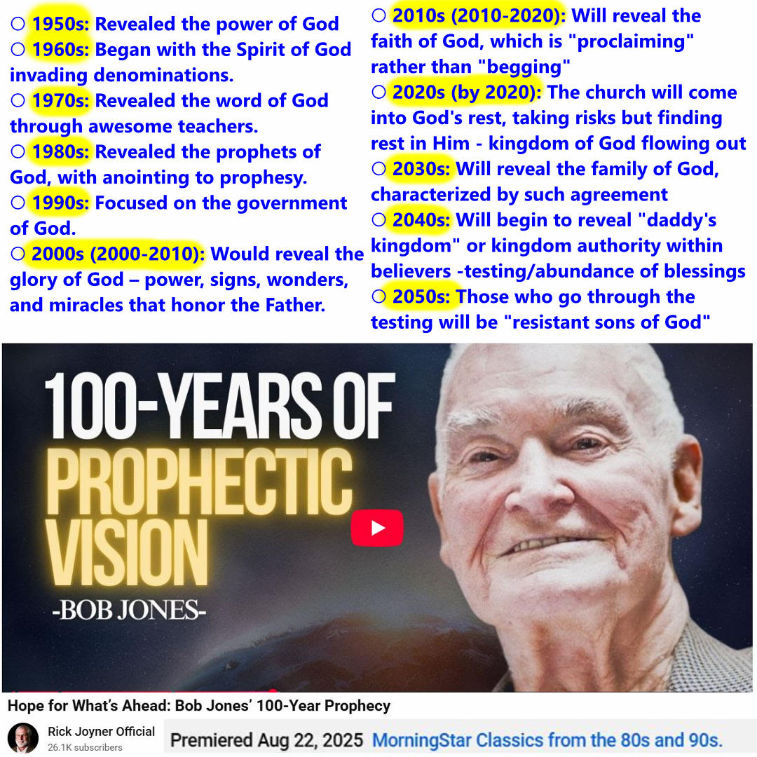 - Bob Jones’ 100-Year Prophecy (1950s – 2050s) Jones outlines a century-long prophecy detailing spiritual developments: