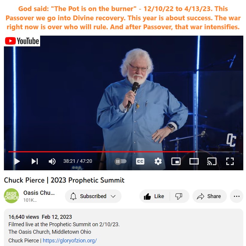 On 2/10/23 Chuck Pierce shared a prophetic word. God said: The Pot will be on the burner between December 10, 2022 – Passover 2023 (April 13). Ohio is the State of Reformation. This Passover we go into Divine recovery. This year is about success. The war right now is over who will rule. And after Passover, that war intensifies. Please see video link and partial transcript below: