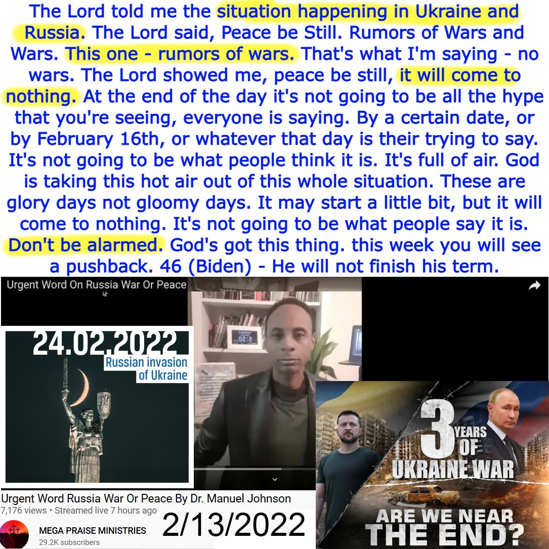Ukraine War will come to nothing. Prophecy by Manuel Johnson on 2/13/22 (9 days before the 3-year long war begun). See partial transcript and video link below: