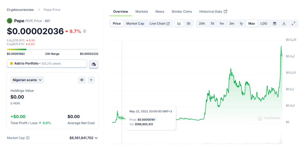 On May 22, 2023 (Christina mentioned Pepe) the price of pepe was $0.00000161