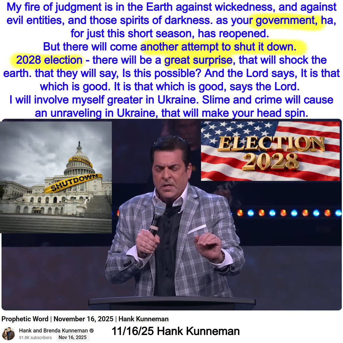 Another Government Shutdown attempt. 2028 Election Surprise. Prophecy by Hank Kunneman on 11/16/25. See transcript, my summary, and video link below:
