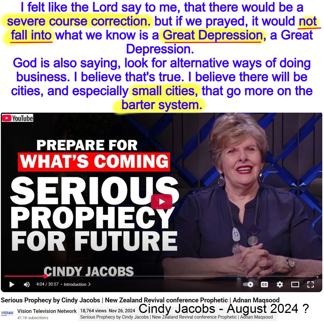 Sever Course Correction, Great Depression, Barter System in small cities. Prophecy by Cindy Jacobs in 2024. Unfortunately I don’t have an exact prophecy date, because the original video is missing. However, the earliest video I was able to find was reposted on 8/16/2024.