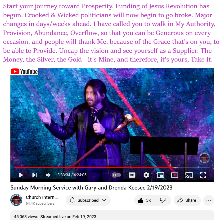Lastly the prophecy says, it has begun – the funding of the Jesus Revolution. “It” refers to the wealth transfer that will fund this coming Jesus Revolution. In the earlier part of the message Robin Bullock discussed how we are currently seeing a revival break out in many places like Asbury, and all these revivals will lead to the big Jesus Revolution. He said “in a matter of months”, so within the next few months the Jesus Revolution will start.