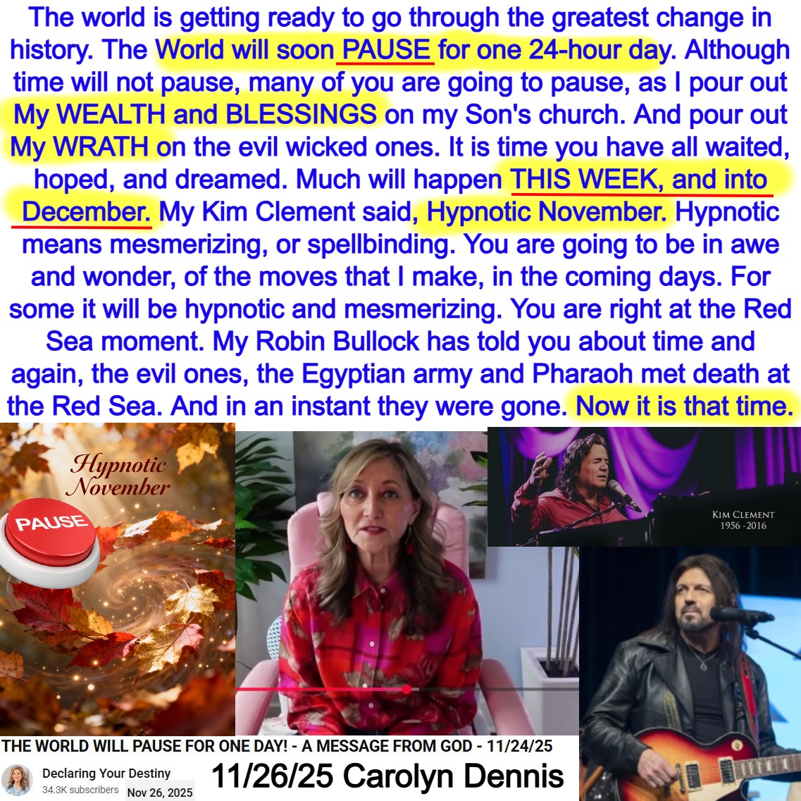 The world will soon pause for one day, one 24-hour day. Much will happen this week, and into December. Hypnotic November. you are going to be in awe and wonder, of the moves that I make, in the coming days. Prophecy by Carolyn Dennis on 11/26/25. See partial transcript, AI Summary, and video link below: